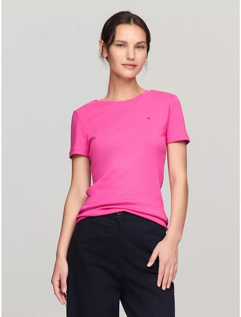 Женская футболка Tommy Hilfiger. Наши любимые футболки, изготовленные из мягкого, комфортного хлопка средней плотности, подходят по фигуре. Они так же легко надеваются под блейзер, как и под толстовку с капюшоном на молнии, и смотрятся как самостоятельная вещь.