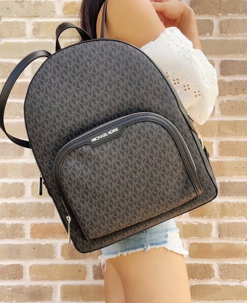 Стильный женский рюкзак от американского бренда Michael Kors модель Jaycee large изготовлен из искусственной кожи и канваса с нанесенной серо-черной лого монограммой. Серебристая металлическая фурнитура. Два вместительных отделения закрываются на молнии. Внешний передний накладной карман на молнии декорирован черной отделкой по краю и серебристым металлическим лого бренда Michael Kors. Мягкие регулируемые ремни и небольшая ручка для переноски выполнены из искусственной кожи черного цвета. Внутри: два отделения с черной атласной брендированной подкладкой, один карман на молнии и два накладных кармана.