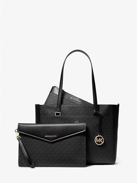 Комплект состоит из трех сумок: тоут, конверт с клапаном под документы и кошелек на молнии. Все сумки выполнены из качественного материала - 100% канвас, отделка из натуральной и искусственной кожи.